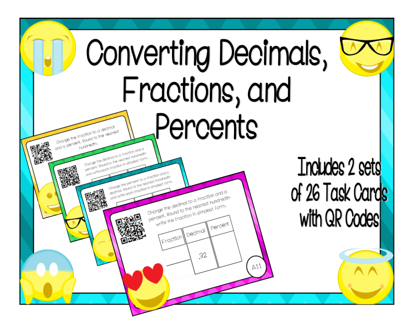 This pack of task cards includes 21 pages (two sets of 26 cards) and is a great way to give students the extra practice they need with this skill. Each card gives a decimal, a fraction, or a percent. Students will convert the other two.